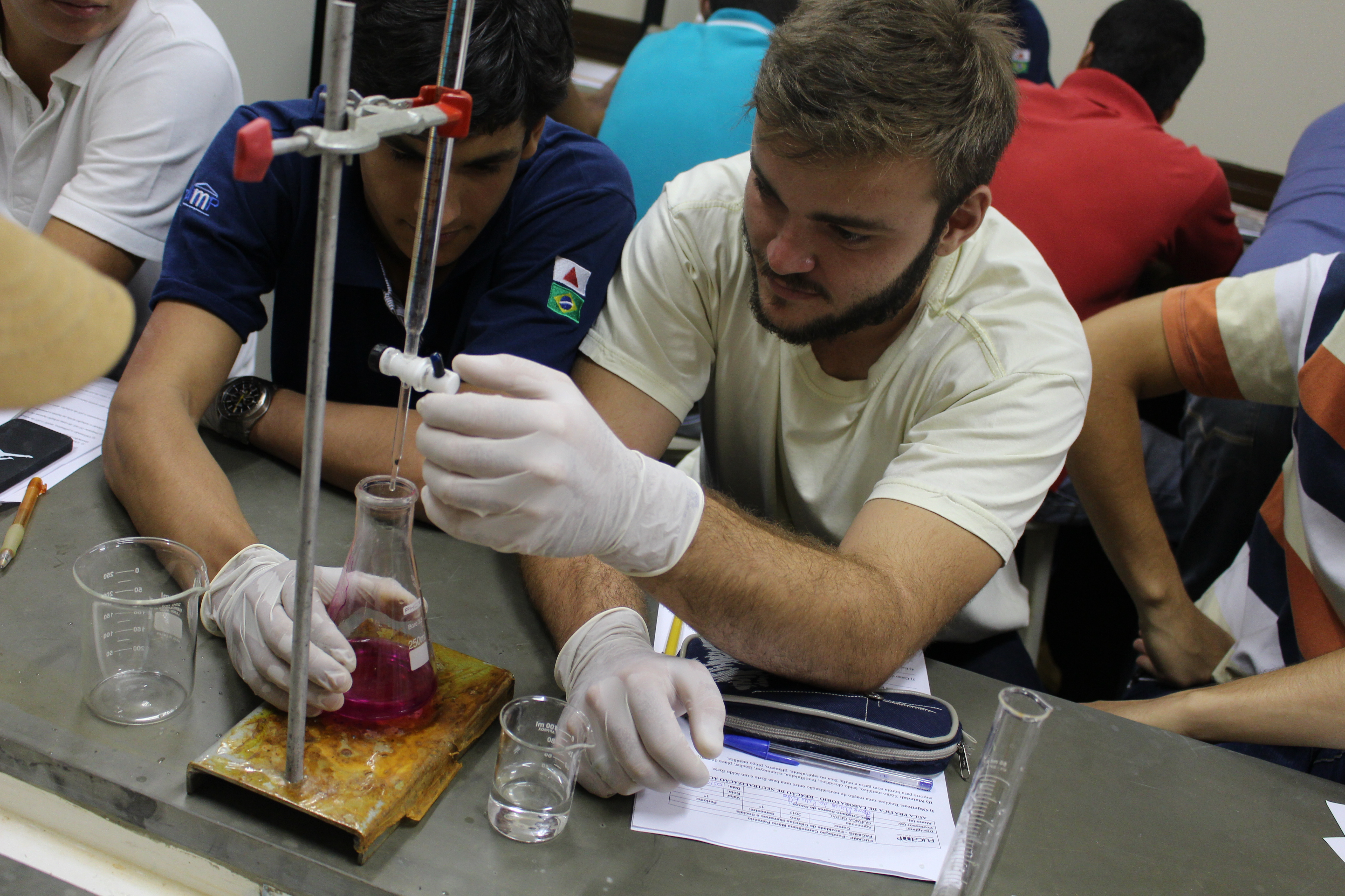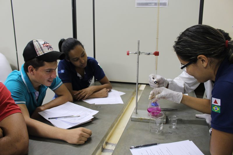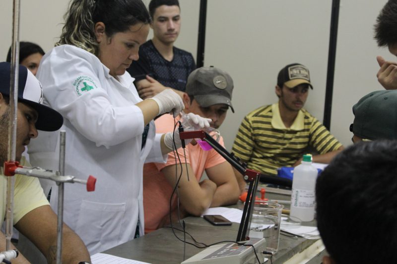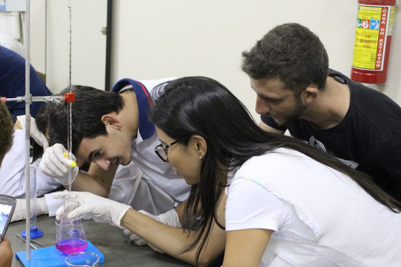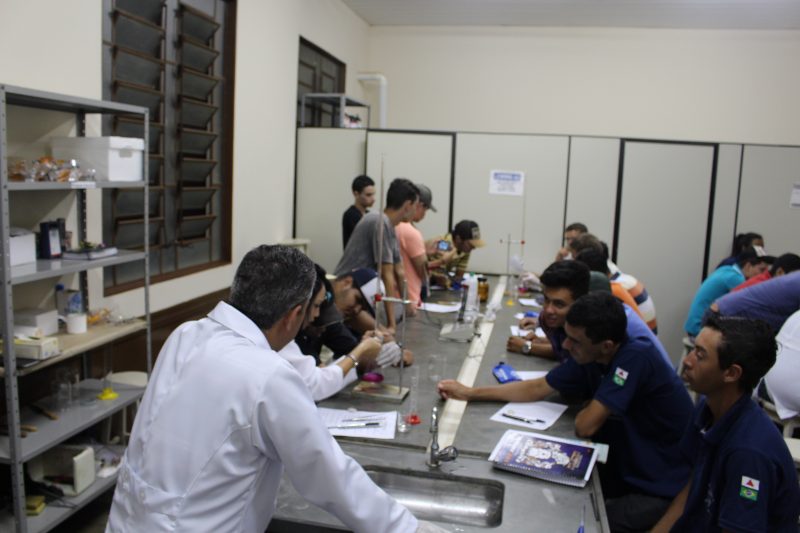Durante a aula, os universitários tiveram a oportunidade de trabalhar com alguns instrumentos utilizados em laboratórios como: Erlenmeyer, Becker, Placa de Petri, Bureta, dentre outros; e também, puderam observar as reações químicas resultantes do experimento feito por eles.
